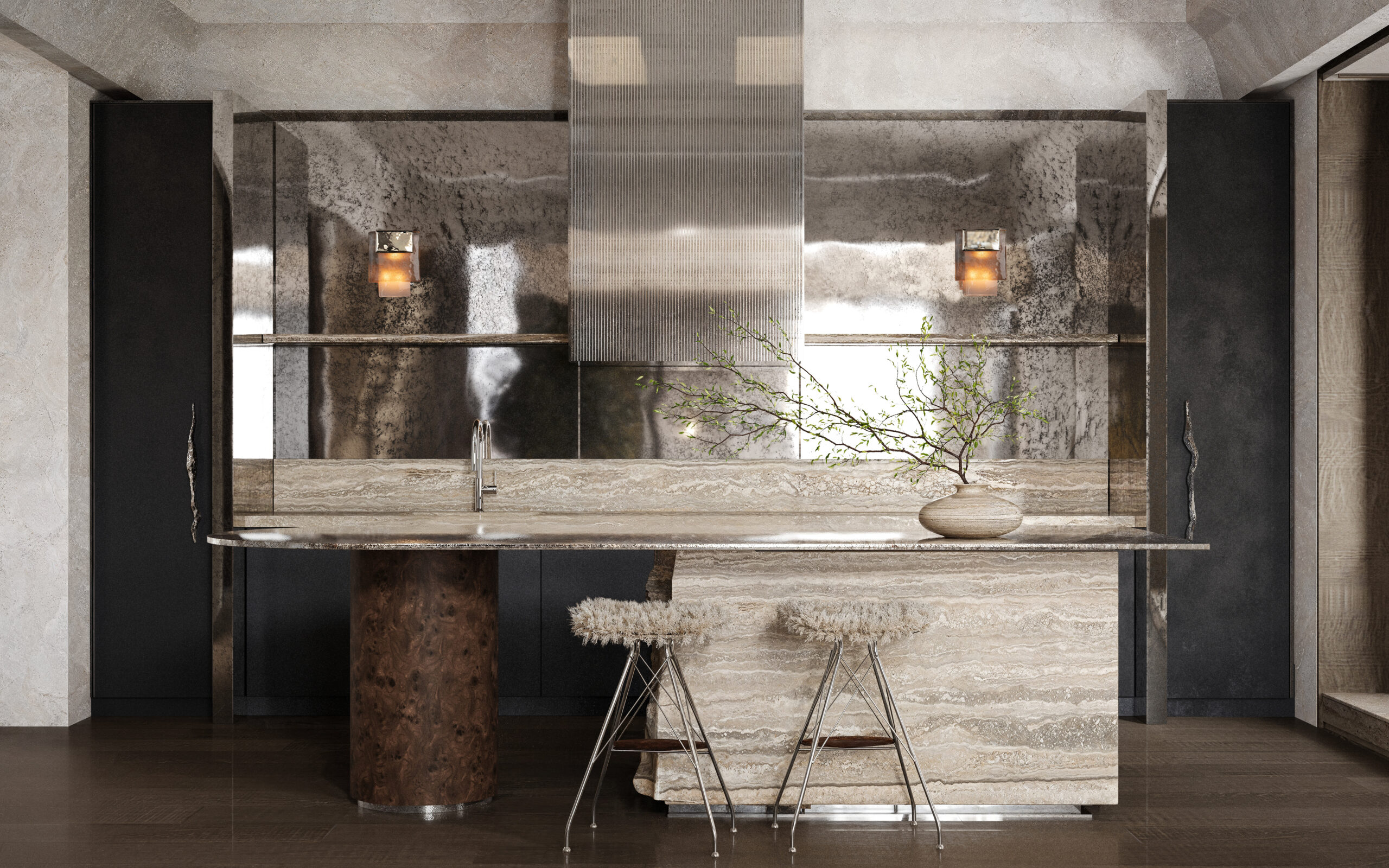Featuring textures such as burl wood, rare types of stone, patinated stainless steel, mosaics of our own design, and pieces by renowned designers from the 20th and 21st centuries, the space embodies both uniqueness and timeless elegance.